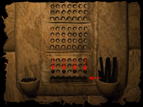Place 3 sticks across the lowest three rows of holes of the second tableau from top down. Take 1 ball and place it into the middle of the upper row of holes of the second tableau from top down. Pick up the obsidian foot from the mouth of the crocodile.