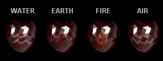 | First, ensure that the cursor hotspot is positioned on the animal as it passes. This should be done towards the right side of the screen. Keeping the cursor in the exact same position, throw the spear as soon as the animal appears on the left side. There's no audible nor visible indication that you've hit the target except that the animal will no longer run across the wall. However, check your inventory to see if it now contains the heart you get for a direct hit. Also note that you may score a hit even if the spear doesn't actually hit the target. The four hearts (Water, Earth, Fire and Air) are identified by their symbols. The symbols are not very clear, so you need to look very closely to see them. | ||||