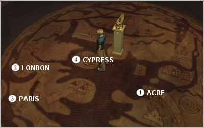 | Examine all the hotspots on the large map on the floor to learn where the various cities are located. Follow Jacques de Molay's route by clicking the cities (use the 'gears' icon) annotated, in the exact same order - ACRE. LONDON, PARIS (only city in France) and CYPRESS. You can then take the cherub from the plinth. | ||||||||||||