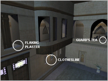 | During the cut scene you see the guard with a dog in the corridor around the corner. Take note that the guard is drinking tea. Did you see a clothesline hanging down outside the window in the alcove? There's also flaking plaster on the window sill where you entered. For a detailed view of the entire area walk into the alcove. | ||||||||||||