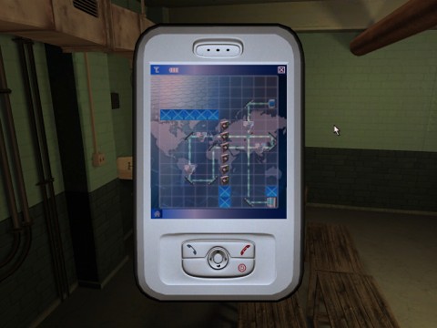 Climb up the ledge. Open the window and enter the room. Enter the room to the left. Examine the waste basket. Re-enter the bedroom. Pick up the rosary from the floor. Examine the credit card receipt. Use your PDA. Click on Connect. Click on Credit R Us. Now it's time for another hacking. Here is the image with all the routers and refractors set correct.