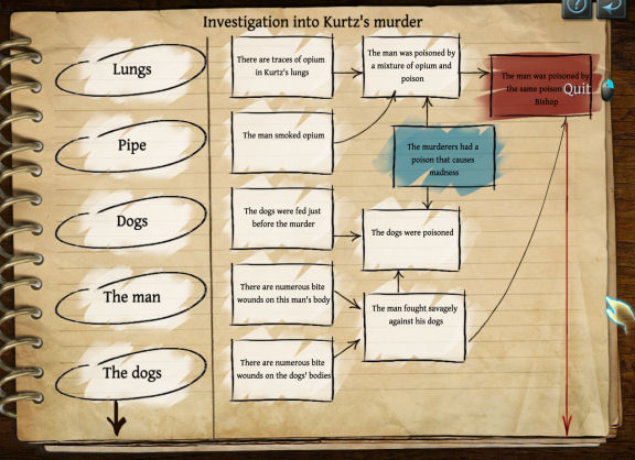 Click on the wealth square. Information that is verified is in blue. Use the return arrow or right mouse click to show the deduction book. Return to the game screen using the camera or left return arrow.