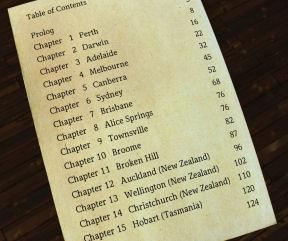 Study the table of contents from the Australia book and see that chapter 3, 7, 10 and 15 are: Adelaide, Brisbane, Broome and Hobart in Tasmania.