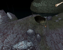 Watery cavern - Make another torch. Go forward and walk on the shallow water. Go left and see an exit blocked by a rock. Take the wooden leg caught by the rock. Go back to center of the cavern and go between the protruding rocks. Go to the left and forward to a gate.