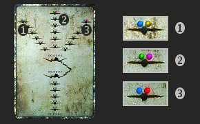 | Examine the white chart (next to the organ) carefully. Each of the three pairs of coloured dots at the top are resting on what resembles an exile's shoulder pads. The colour combinations are identical to those of the miniature plants on the actual shoulders of the three exiles you came across. | ||||||||||||||||